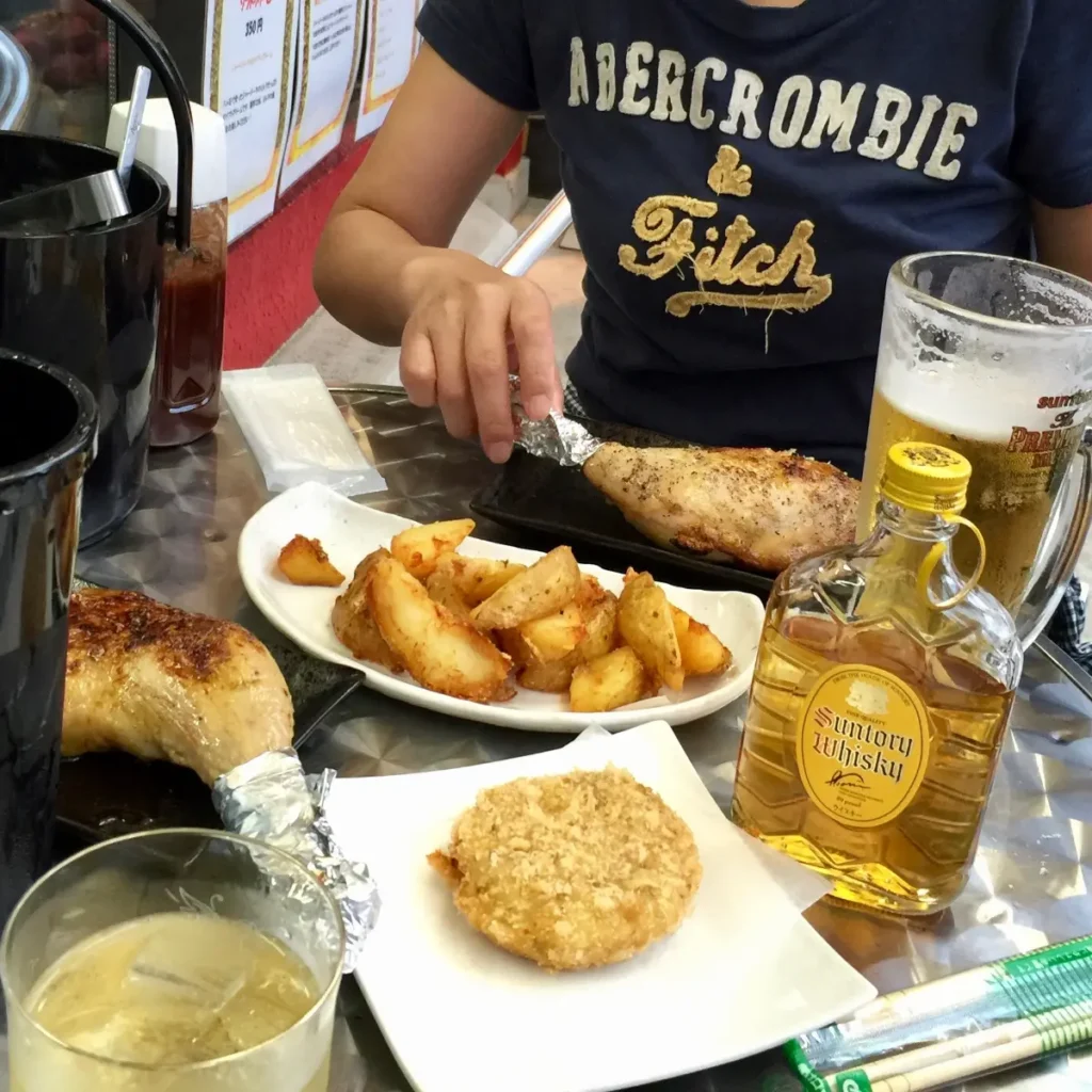 帰りの電車も混みそうだったので、「ここで一杯ひっかけてゆっくり帰ろう」ということになり駅前の焼き鳥屋に腰をおろしました。この店のチキンが美味しく、家族でやっているようでおじいちゃんがチキンを焼いてくれて、娘と孫がお店の手伝いをしていました。夏休みだしね。
