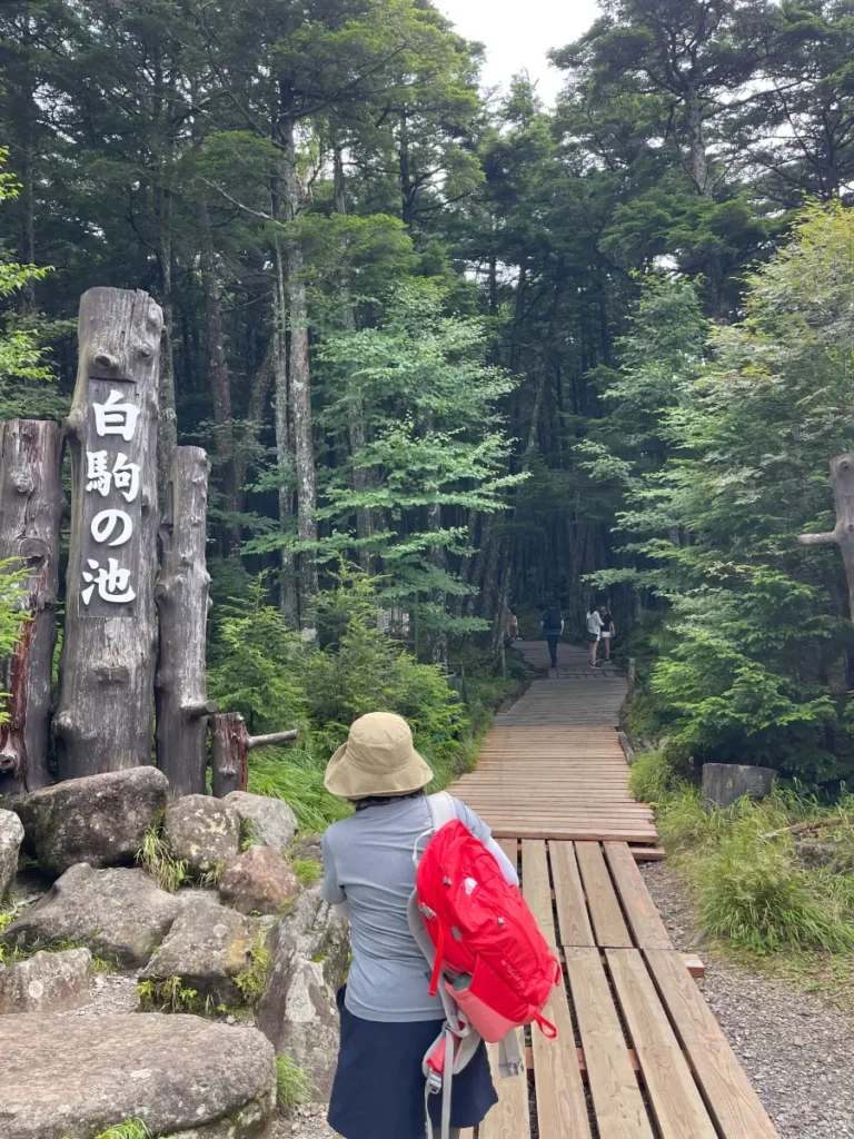 駐車場から少し歩くと、すぐに立派な「白駒の池」の看板が見えます。 ここから一歩進むと、いよいよ神秘の森に行く〜って感じになります。