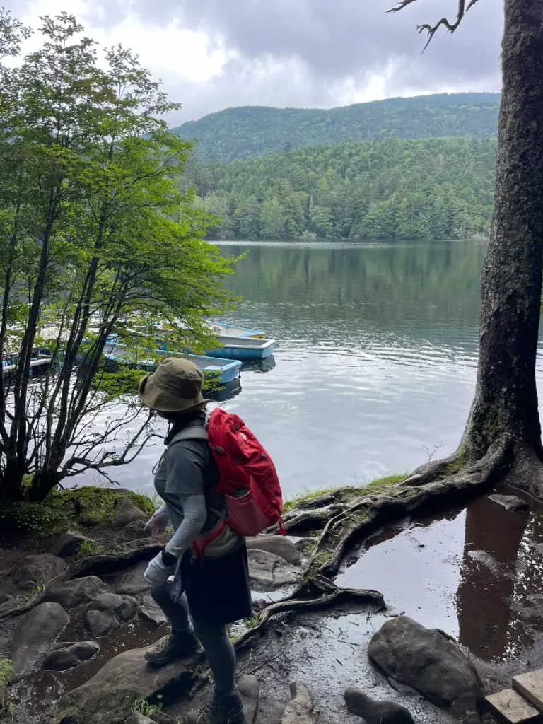 波の音が静かに響いて、本当に穏やかな空間。この白駒の池、実は標高2,100m以上の高地にある天然湖としては、日本最大の大きさらしい。前回来た時は天気が良くて水面に映る周りの木々もすっごく綺麗で、ずっと眺めていられちゃうイメージでしたが今回は曇り空でしたね。ただ空気は気持ちいい!