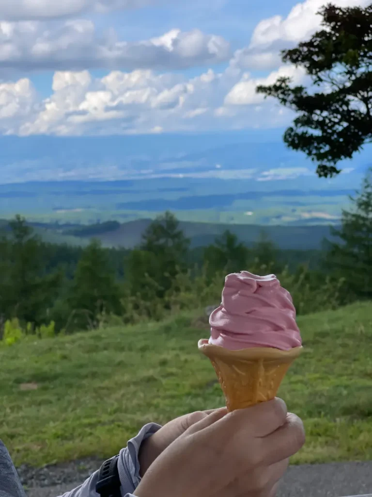 青空と、遠くまで続く山々のパノラマを背景に食べる冷たいソフトクリーム…美味かったです。ただ何味だったか忘れました‥確かご当地名物の〇〇っだった気が‥