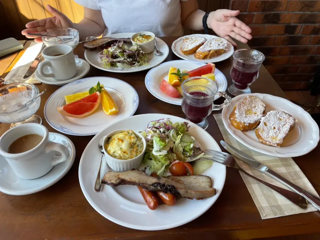 翌朝の朝食、こんがり焼かれた分厚い自家製ベーコンに、甘くてふわふわのフレンチトースト、新鮮な高原野菜のサラダ!大満足です〜