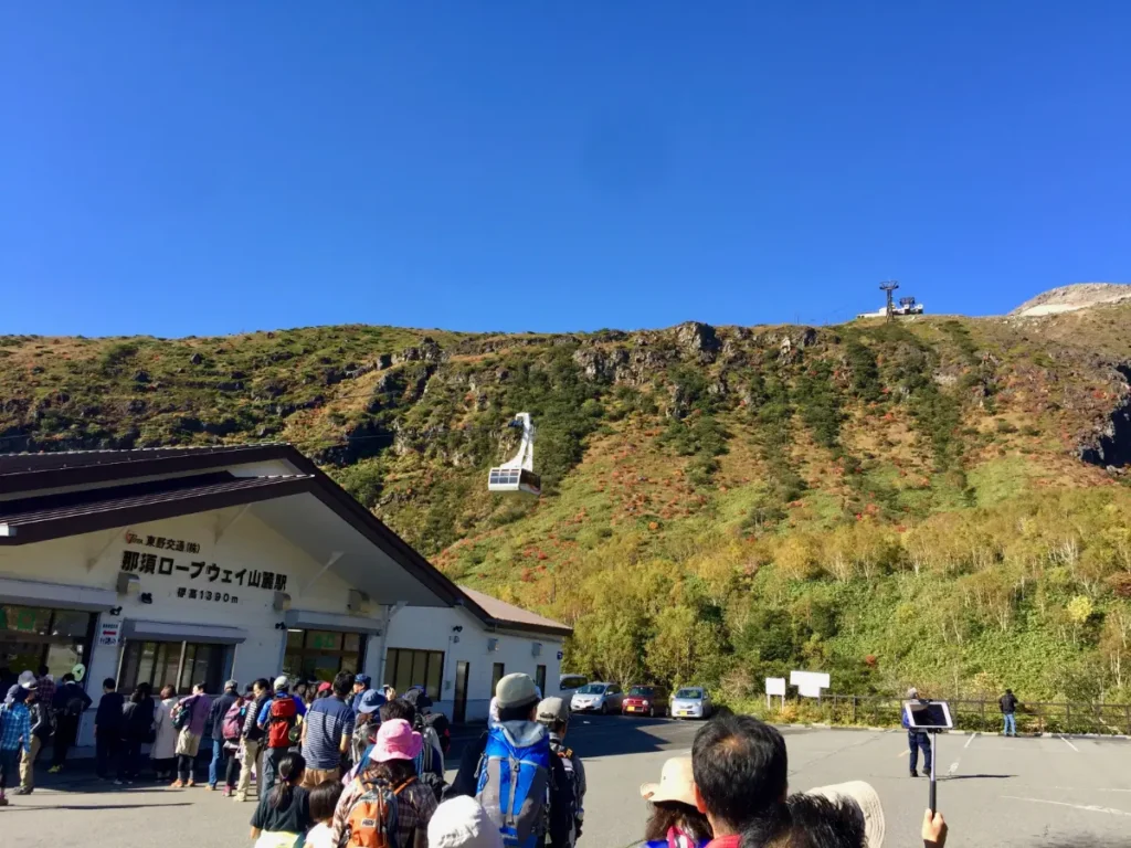 紅葉真っ只中!と言われる那須高原に今回行ってきました。目指すは那須の主峰・茶臼岳!栃木県の最北端にある活火山です。目指すと言ってもこちらには7合目〜9合目までショートカット出来るロープウェイがございます(^^)。残り1合の美味しいところを紅葉眺めながらのプチトレッキング&極上ランチを戴く!という目論見です。1合しか登らないとはいえ、紅葉真っ只中、しかも3連休の中日ということで朝4時に家を出ました。ロープウェイは朝7時前に着いていれば駐車場に入れる確率が高いということで、7時前に到着。しかし駐車場が開くのが8時過ぎといわれ、急な坂道で待機となりました。