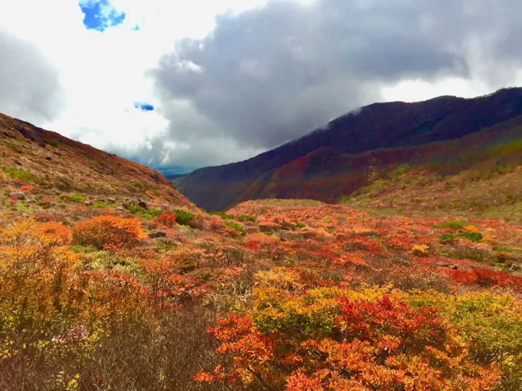山頂方面はごつごつとした岩肌の風景ですが、登山道の牛ヶ首方面には一面紅葉が広がっていました。
