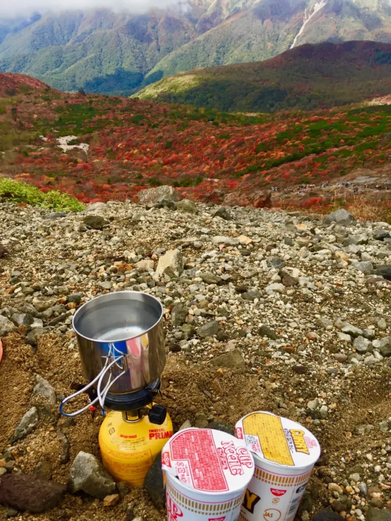 恒例のカップ麺セットです〜(^^)。紅葉を見下ろしながらのカップヌードルは最高でした!