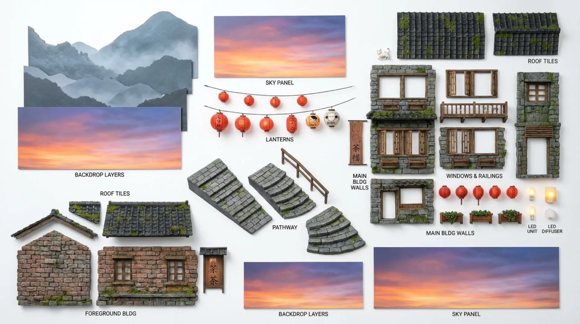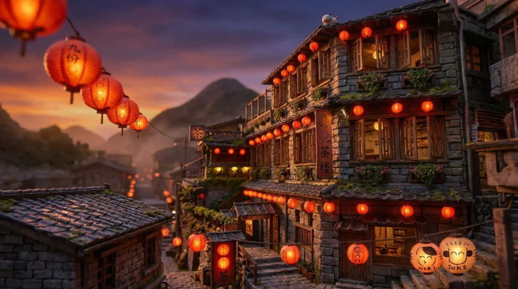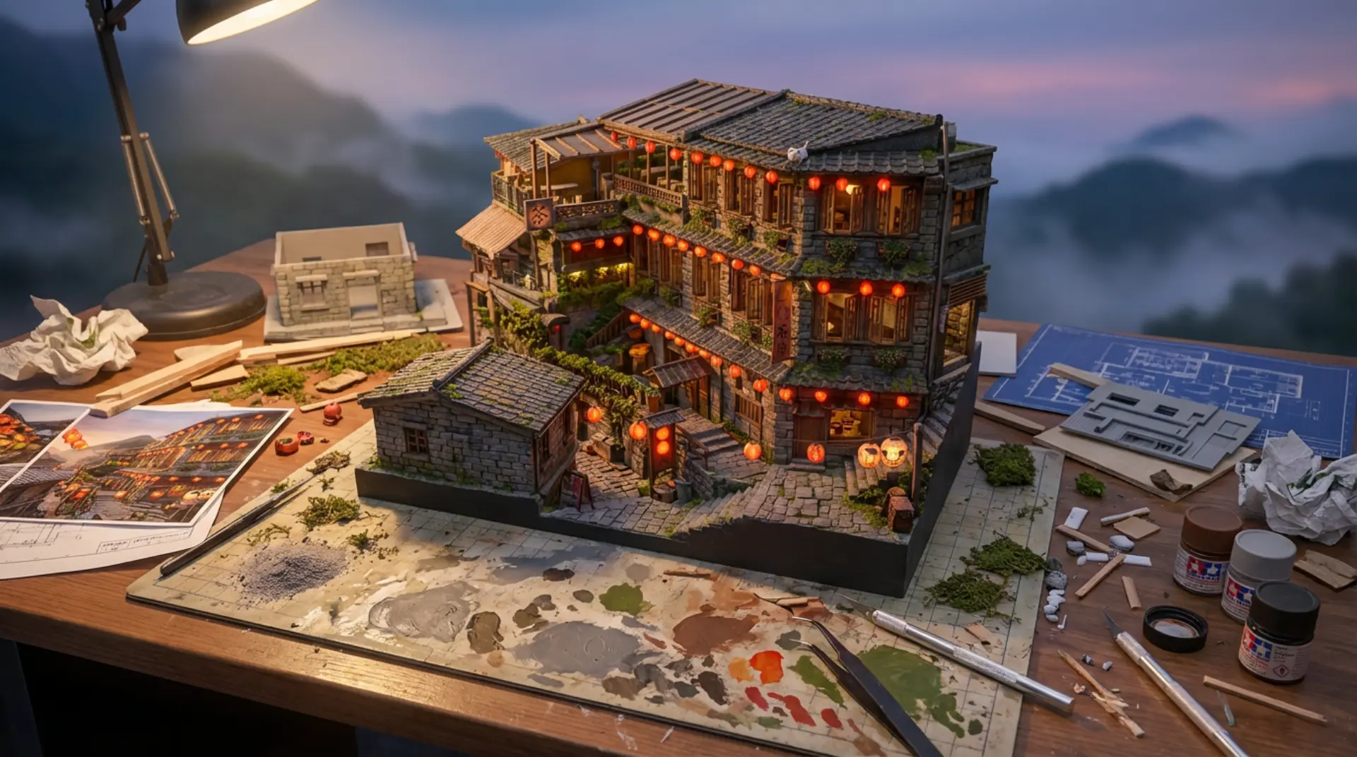 九份のあの幻想的な階段と赤い提灯の灯りをジオラマイメージ化。石畳の階段や古い建物の苔むした質感もなん度も試行錯誤。背景を夕景にセットして、あの独特な熱気と路地裏の匂いまで感じられるような、旅情たっぷりに仕上げました。