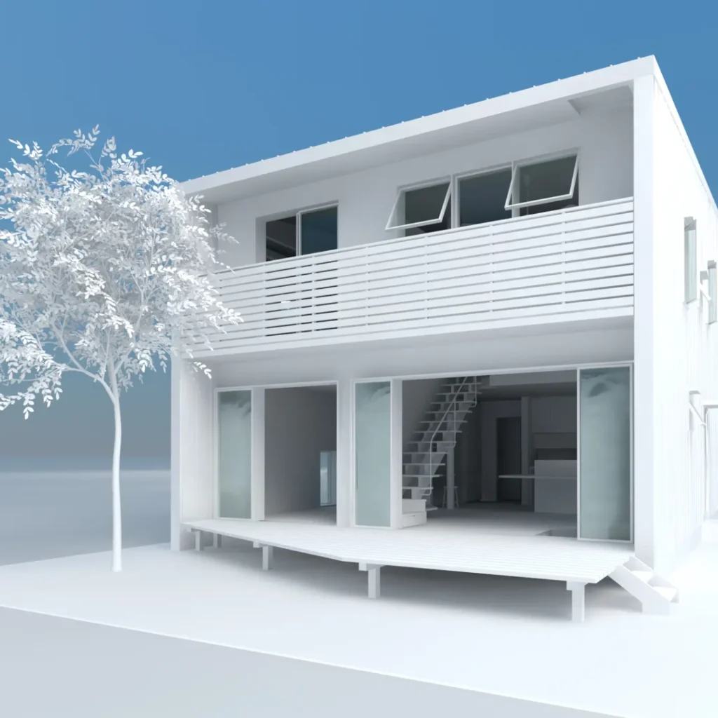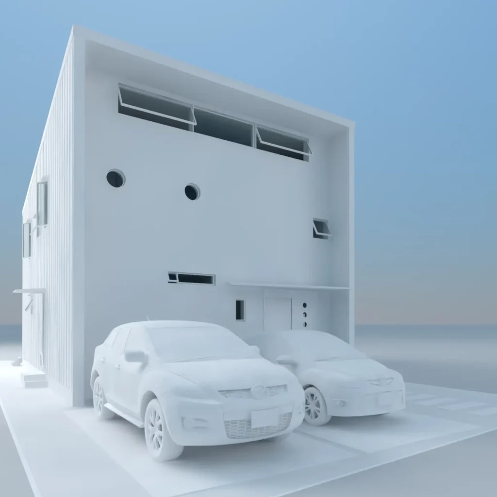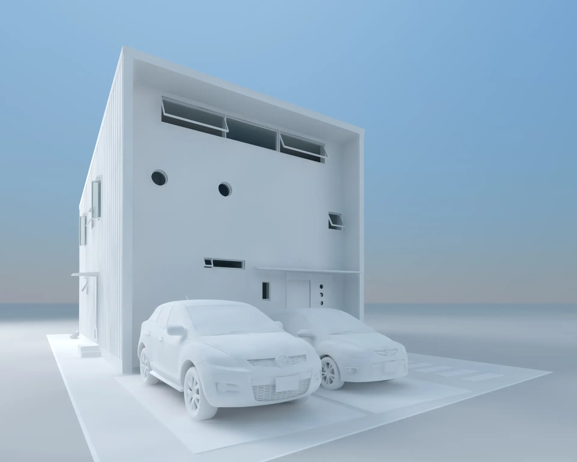 外構は駐車スペースのヴォリューム検証から。実際の見え方を意識し正確に打ち込んだ。外装材はまだ表現しなかった。この時点でのイメージを固めたくなかったからだ。