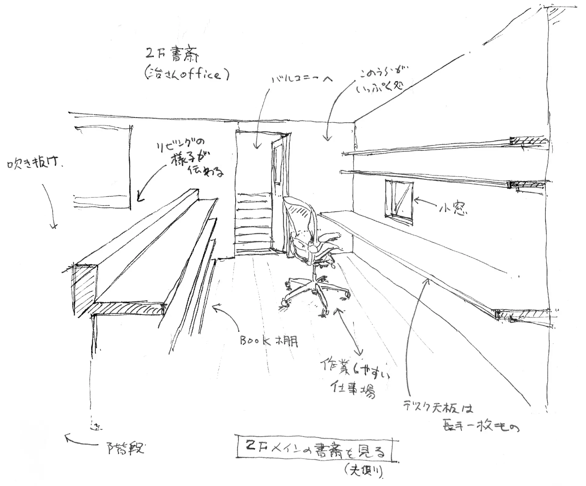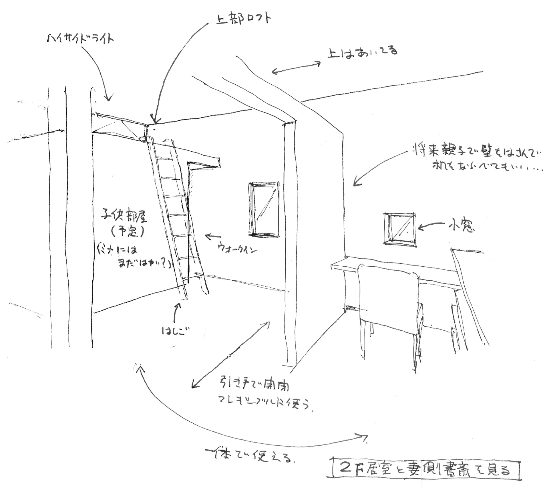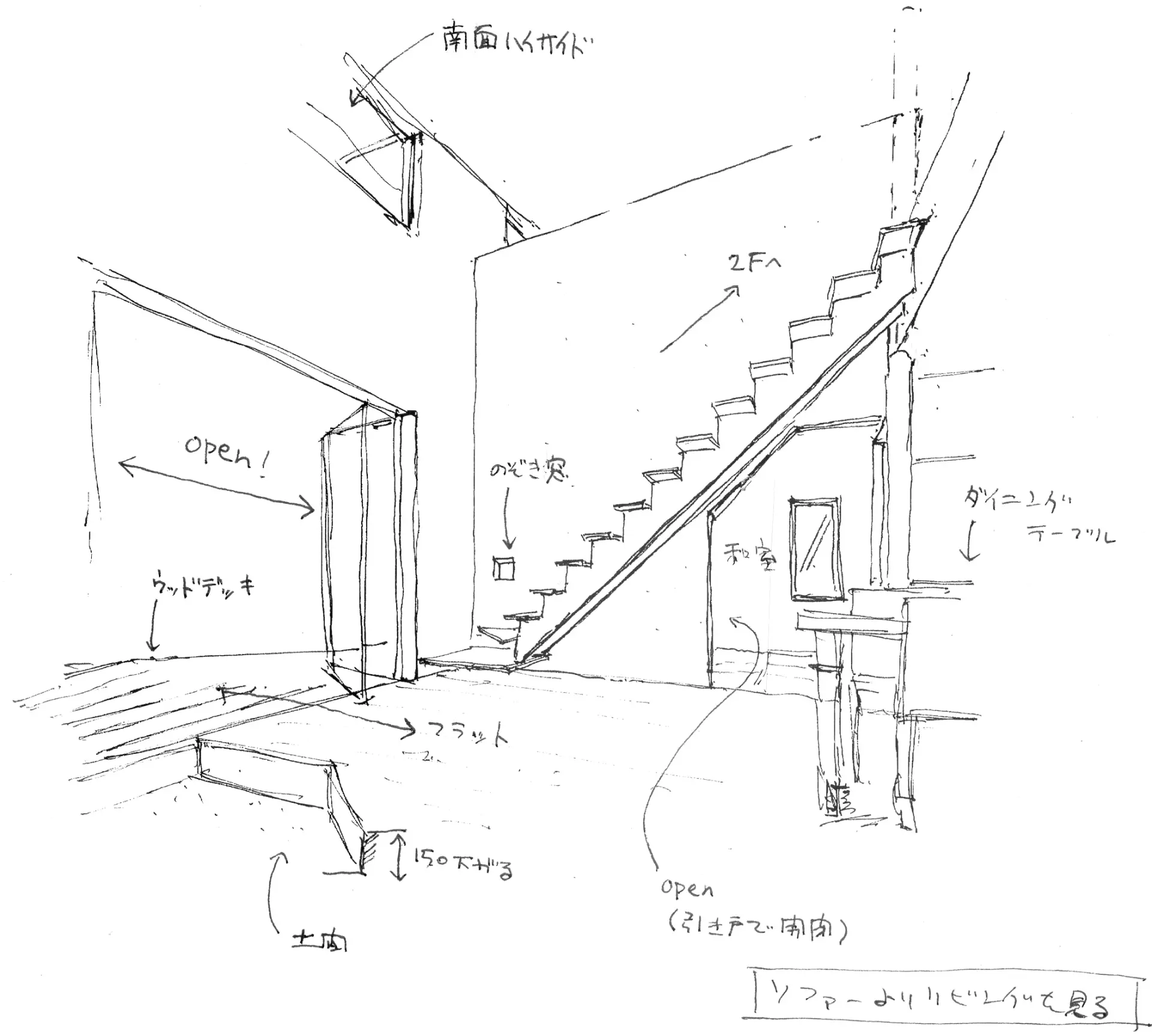 施主夫婦とは縁の深い間柄。家作りの相談に乗っていたところ、プランを描いたのがキッカケでデザインを受けることになった。まぁ、私達には注文を言いやすかったのだろう(^^)