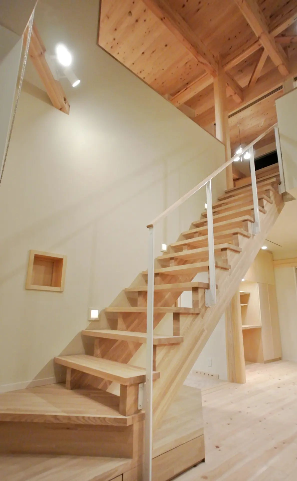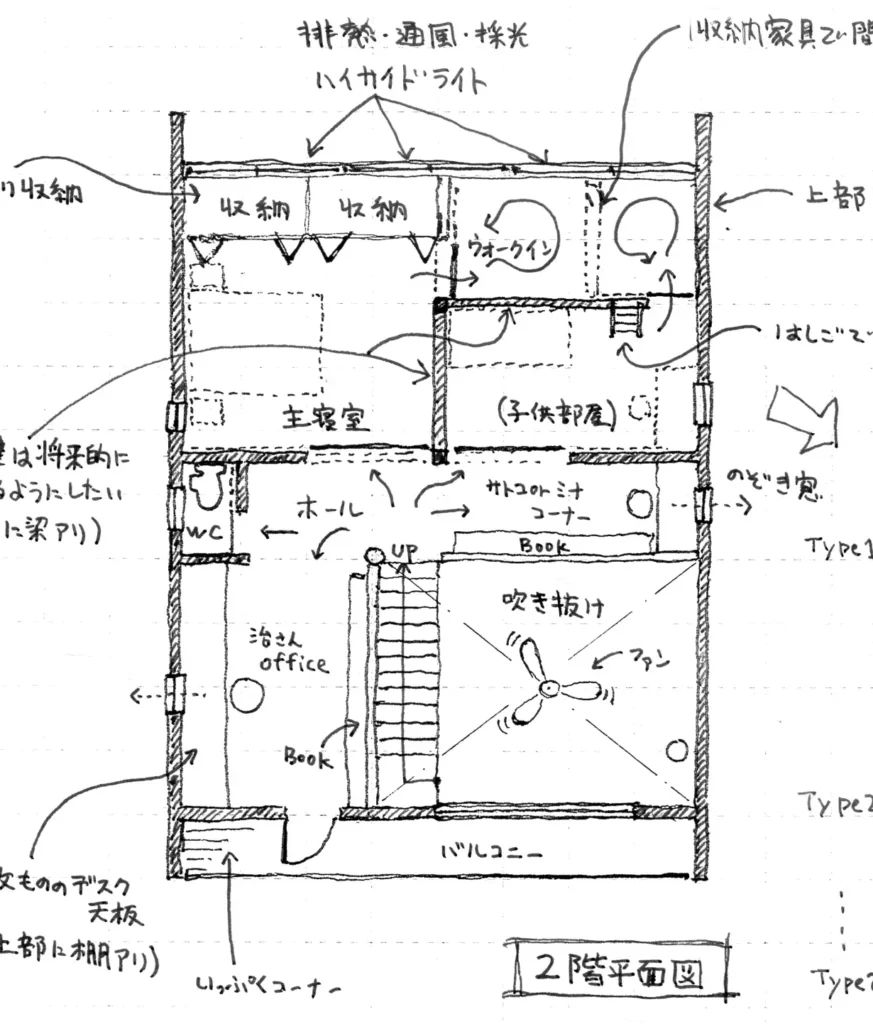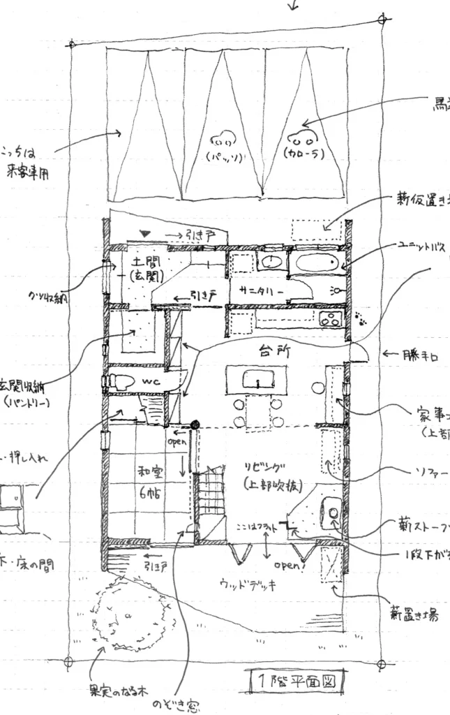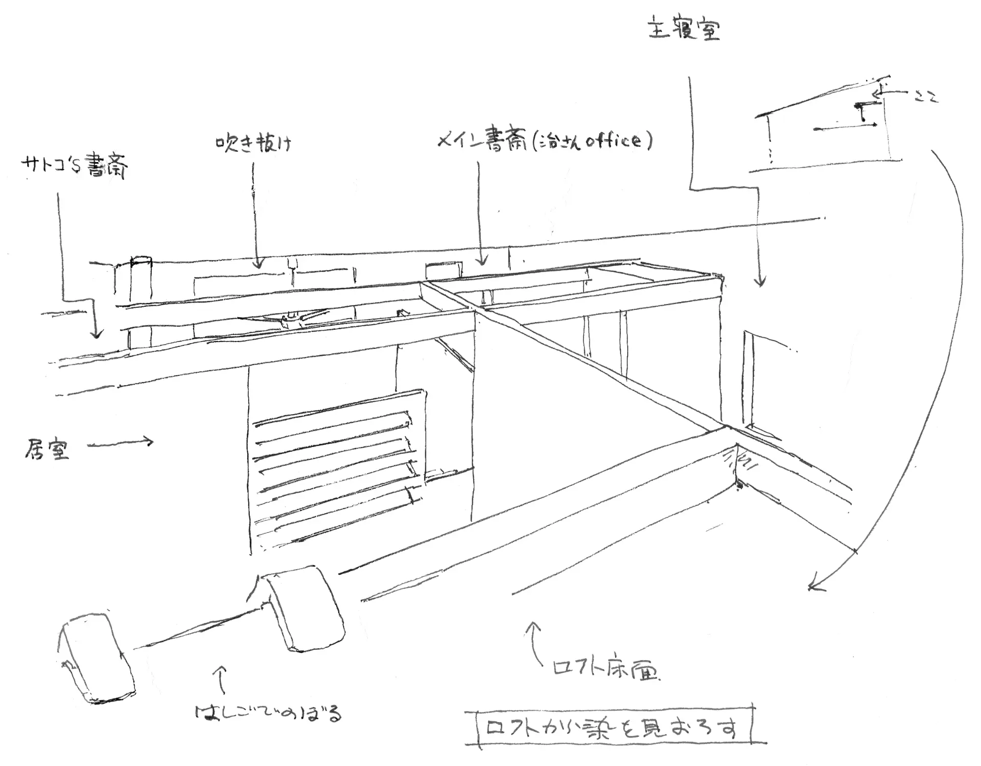 施主夫婦とは縁の深い間柄。家作りの相談に乗っていたところ、プランを描いたのがキッカケでデザインを受けることになった。まぁ、私達には注文を言いやすかったのだろう(^^)