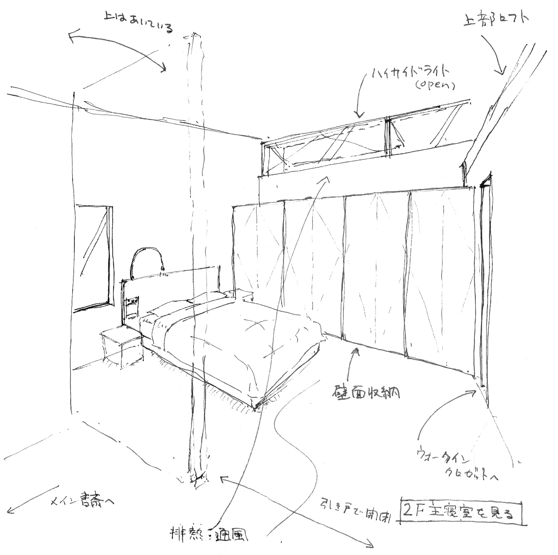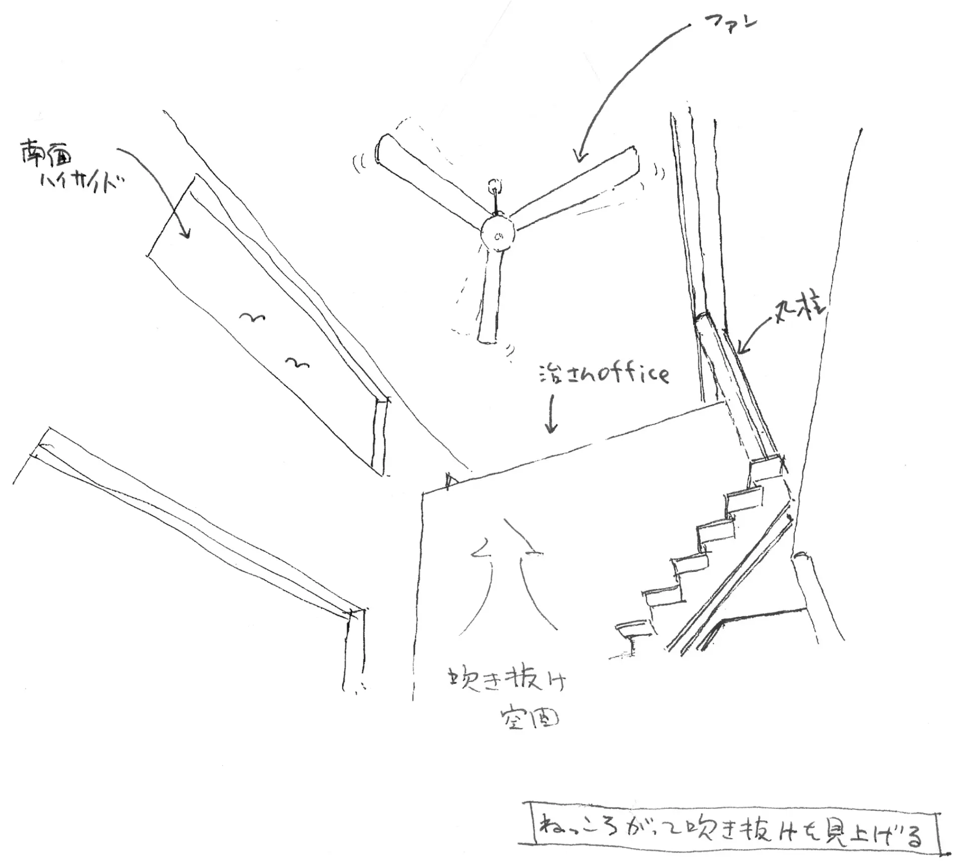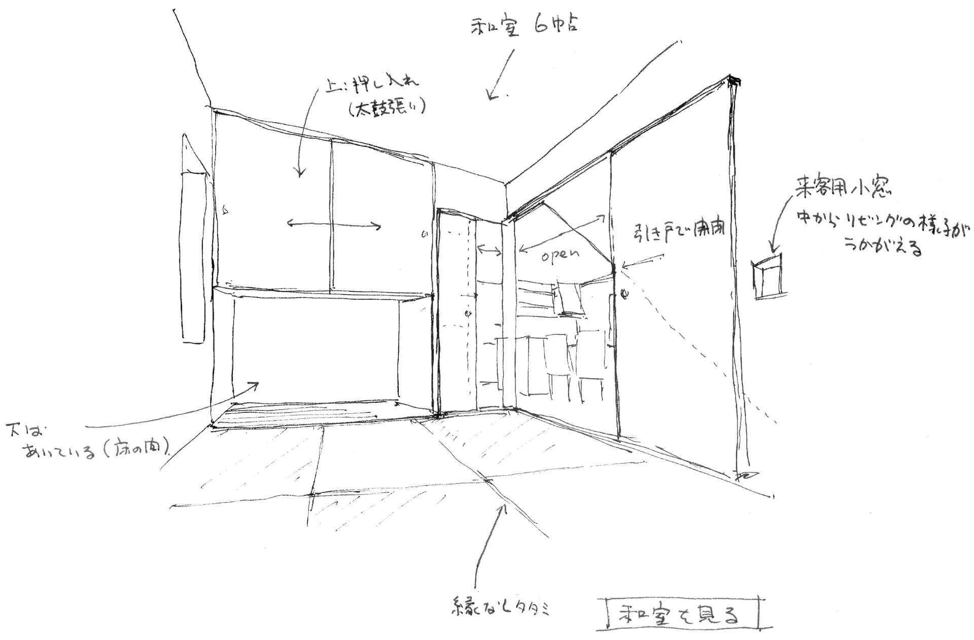 東京と福島という距離。打ち合わせはウェブカメラ越しに行った。図面を作っても伝わらないと思い、とにかくラフでも絵を描くことにした。時間も限られていたので着色はせず、線画イメージで進めた。