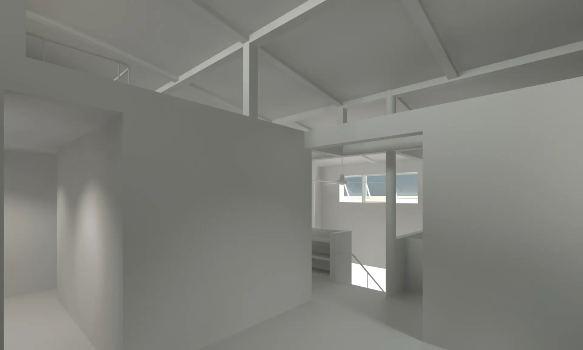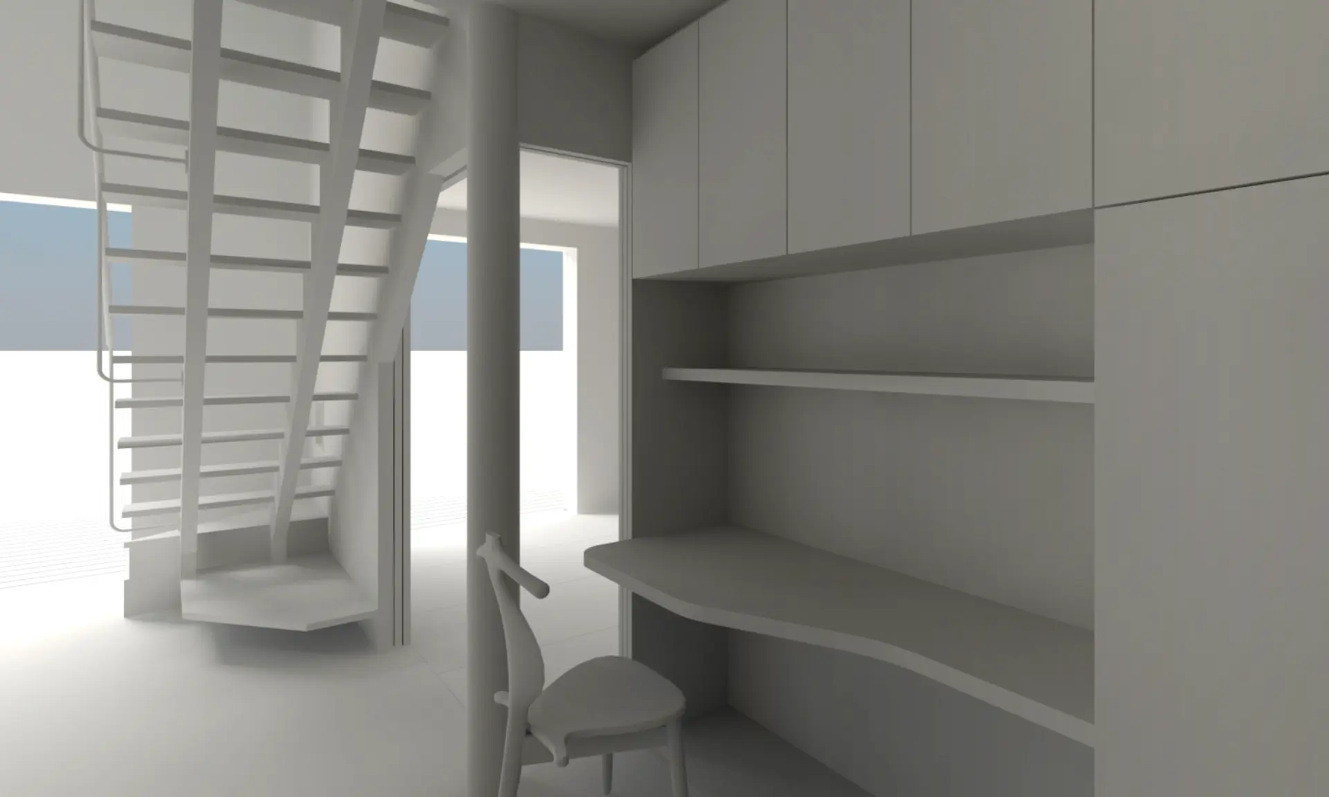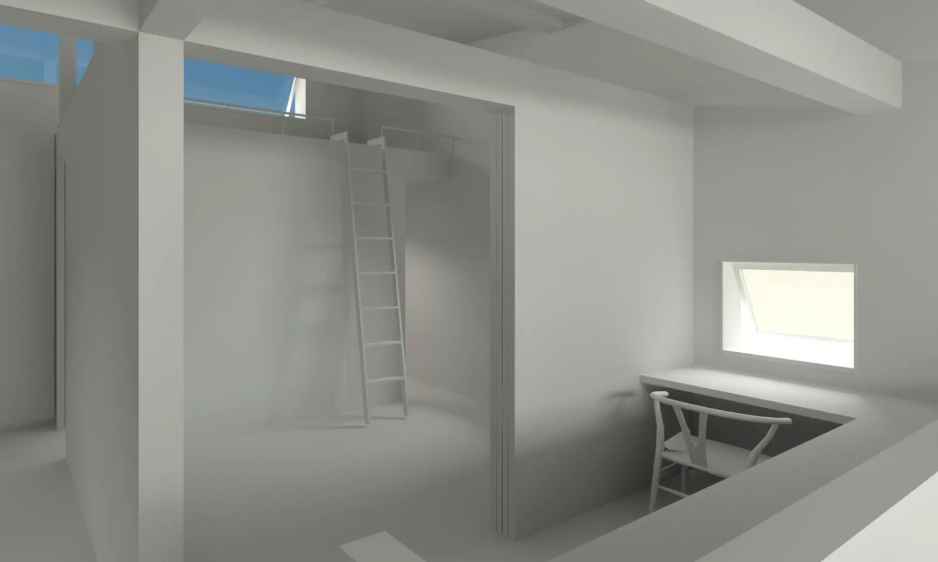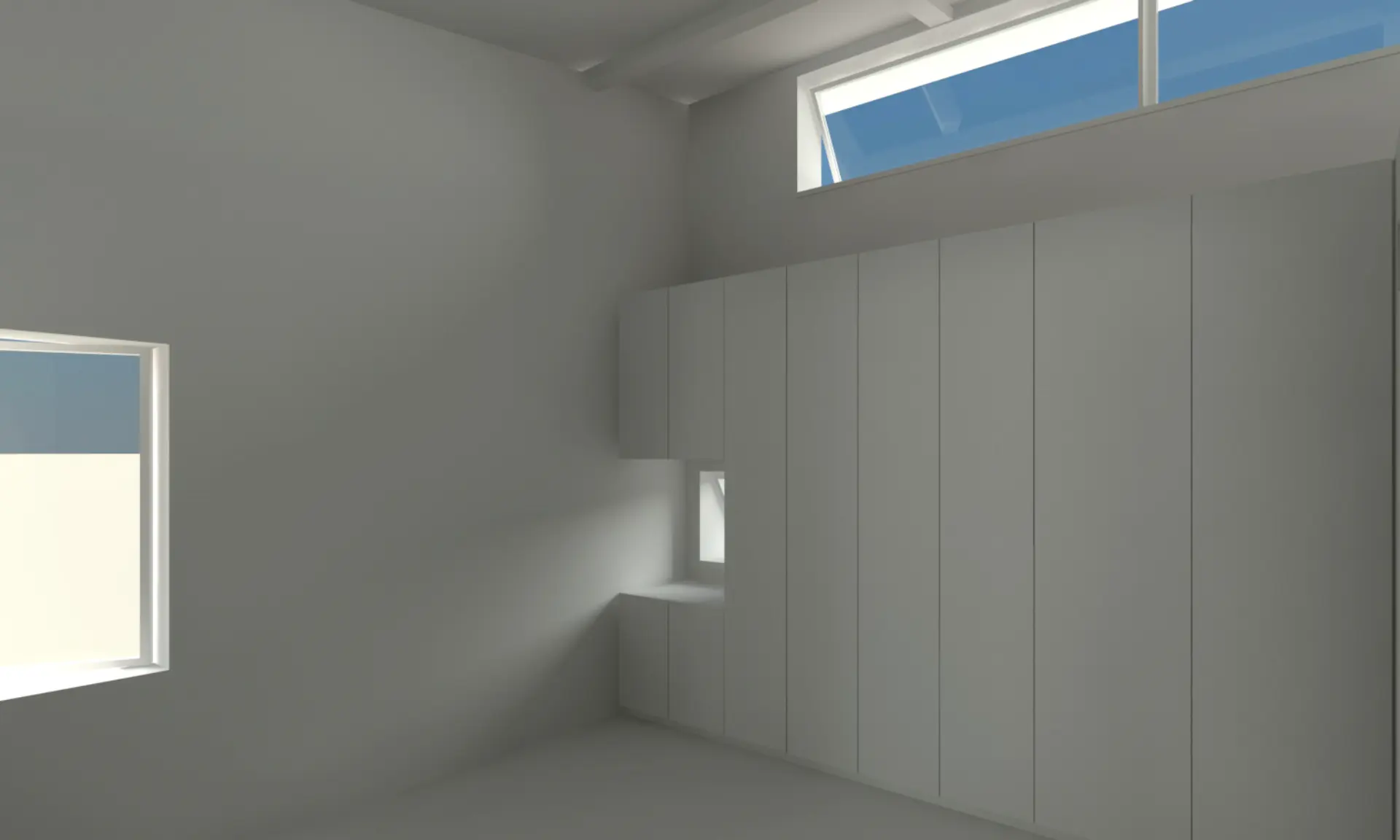 実際に光がどのように廻っているのか検証してみる。設定は5月昼の福島県。コントラストがわかる分、白模型(CG)でも十分検証出来る。各窓からの直接光や床壁からの反射光がどれくらい影響しているのかが見て取れる。施主側にも各部屋のイメージがつかめたと喜んでもらえた。