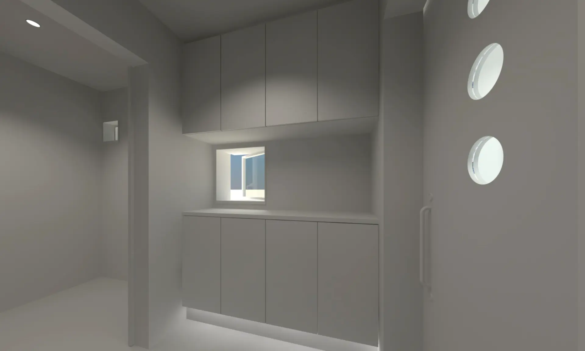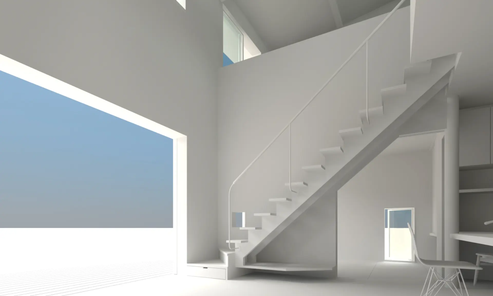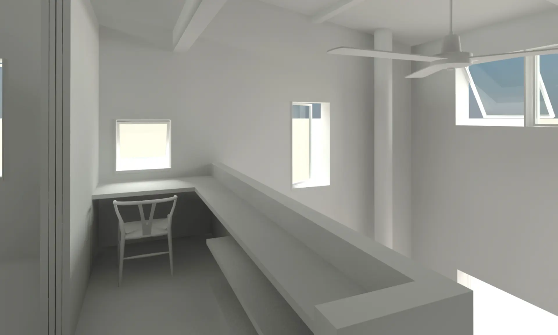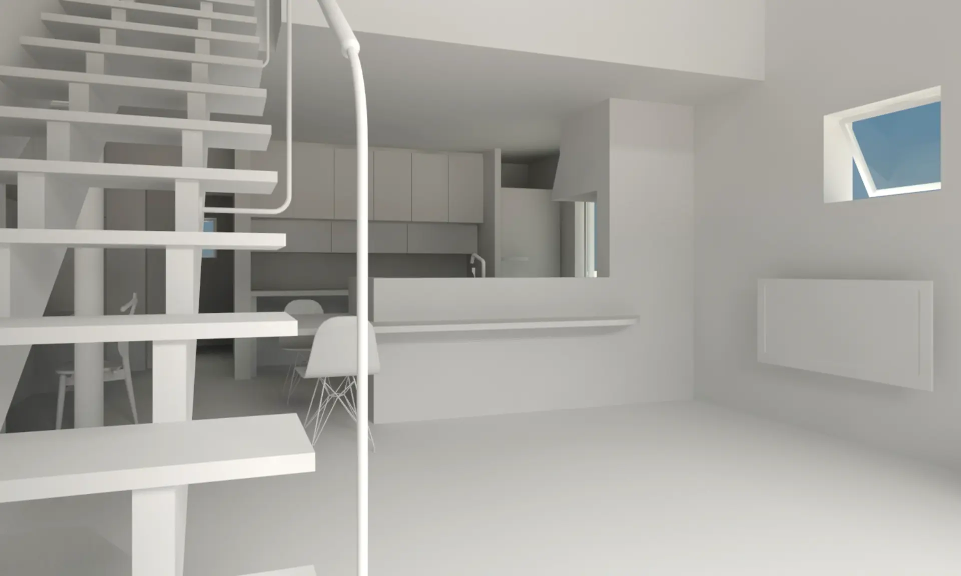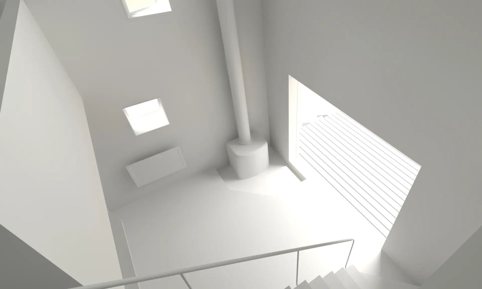 実際に光がどのように廻っているのか検証してみる。設定は5月昼の福島県。コントラストがわかる分、白模型(CG)でも十分検証出来る。各窓からの直接光や床壁からの反射光がどれくらい影響しているのかが見て取れる。施主側にも各部屋のイメージがつかめたと喜んでもらえた。