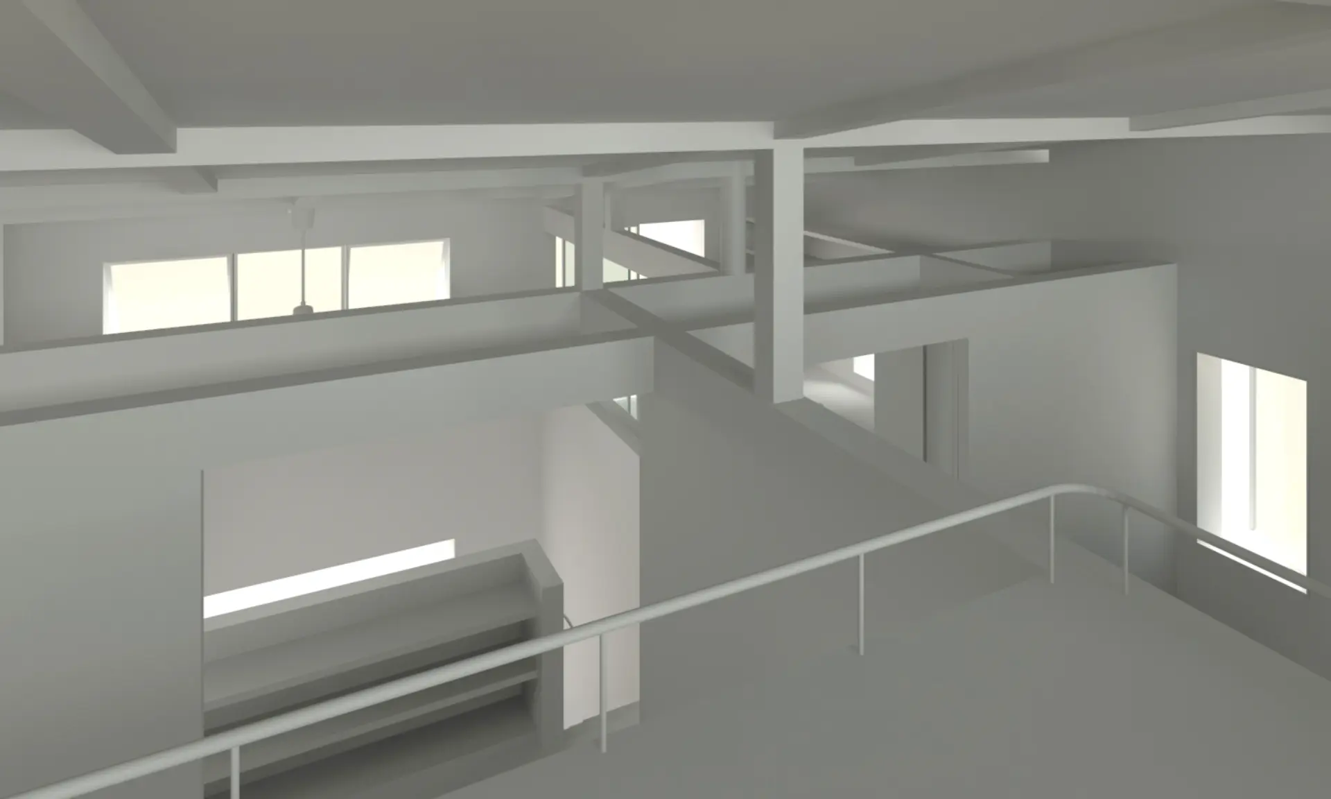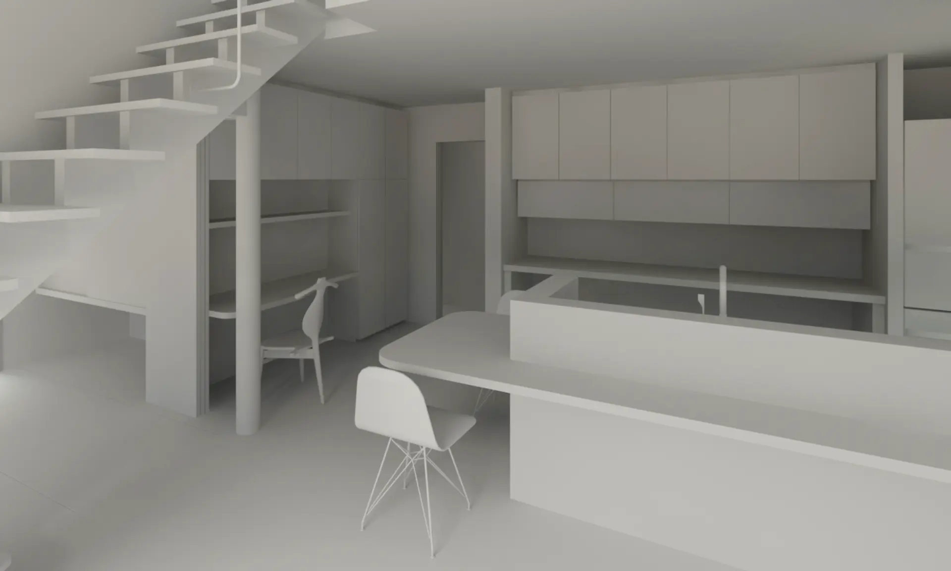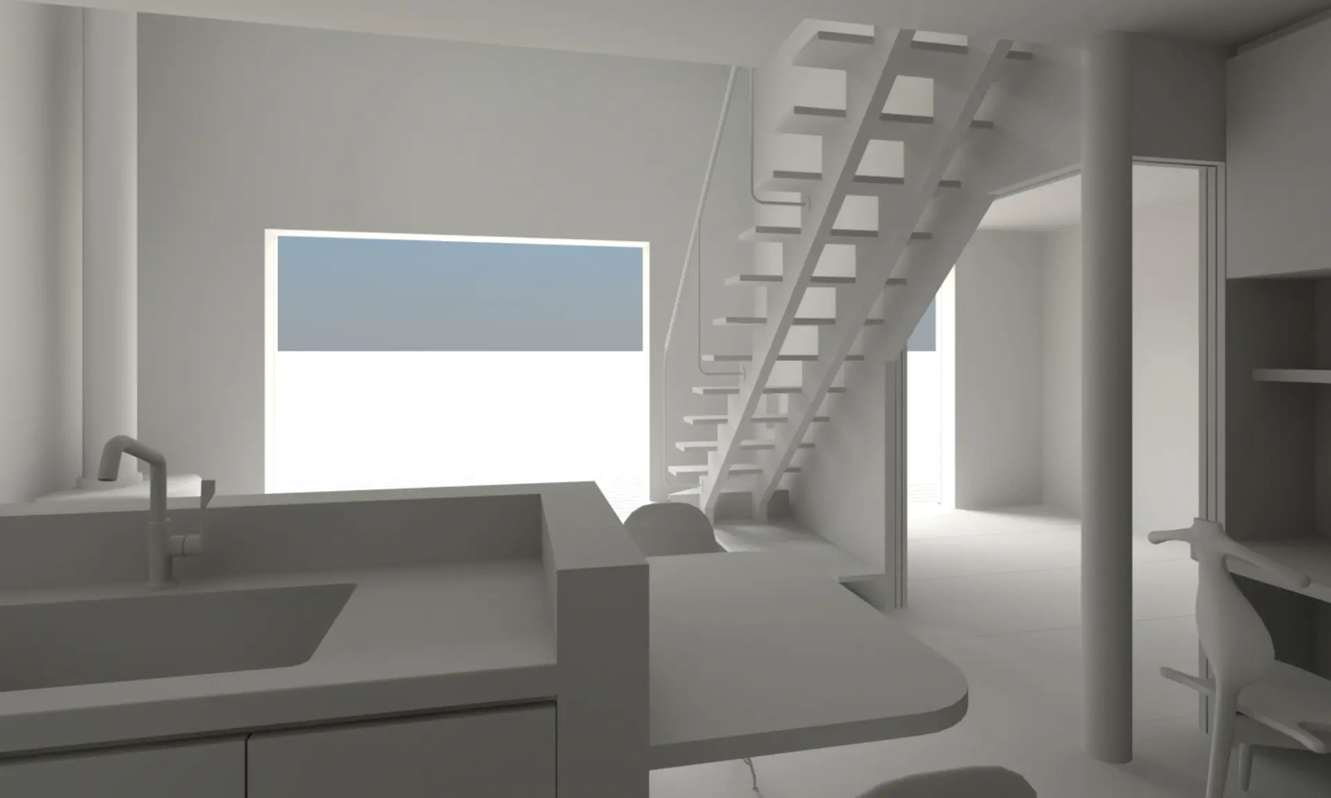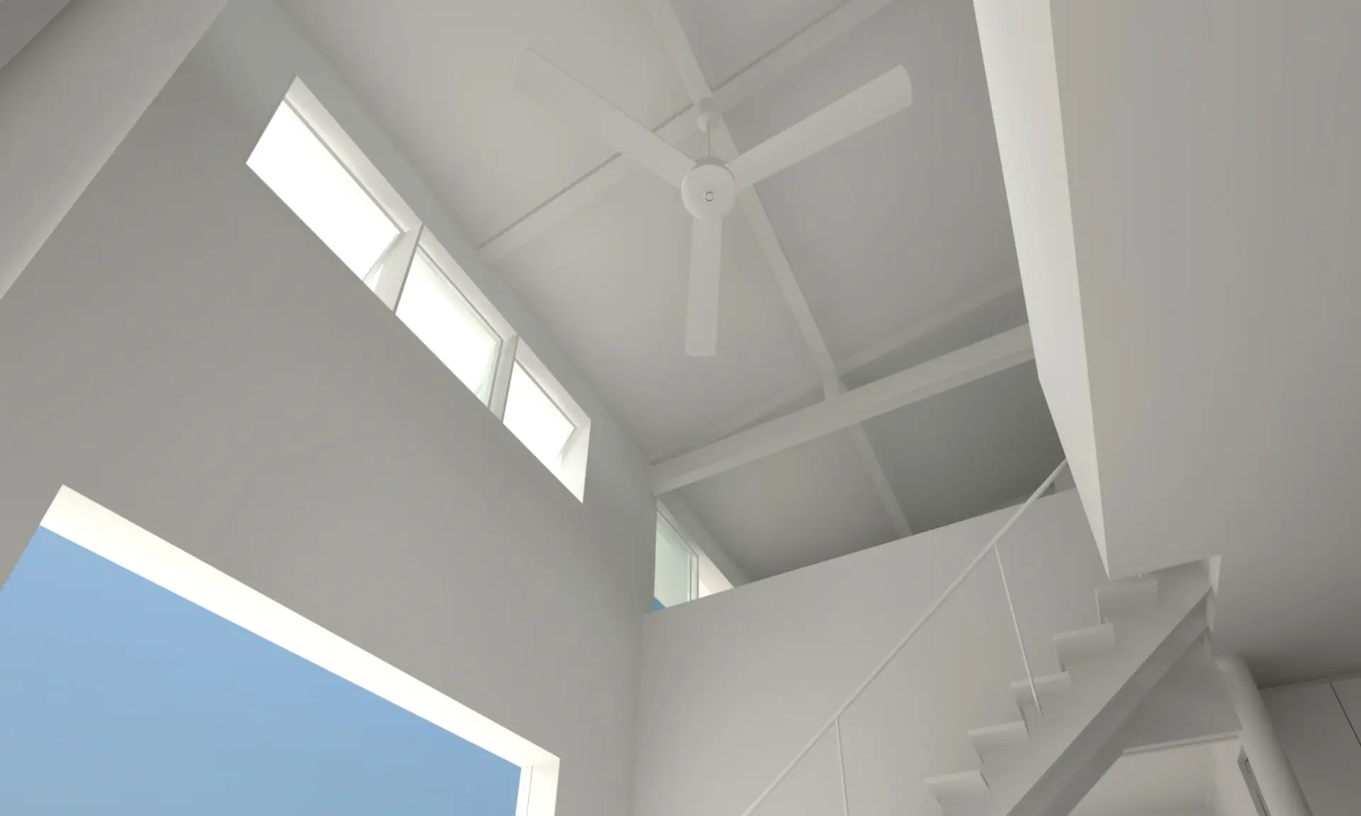 実際に光がどのように廻っているのか検証してみる。設定は5月昼の福島県。コントラストがわかる分、白模型(CG)でも十分検証出来る。各窓からの直接光や床壁からの反射光がどれくらい影響しているのかが見て取れる。施主側にも各部屋のイメージがつかめたと喜んでもらえた。