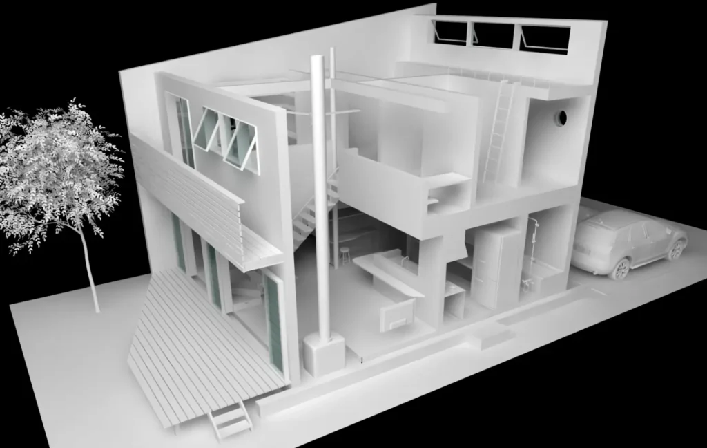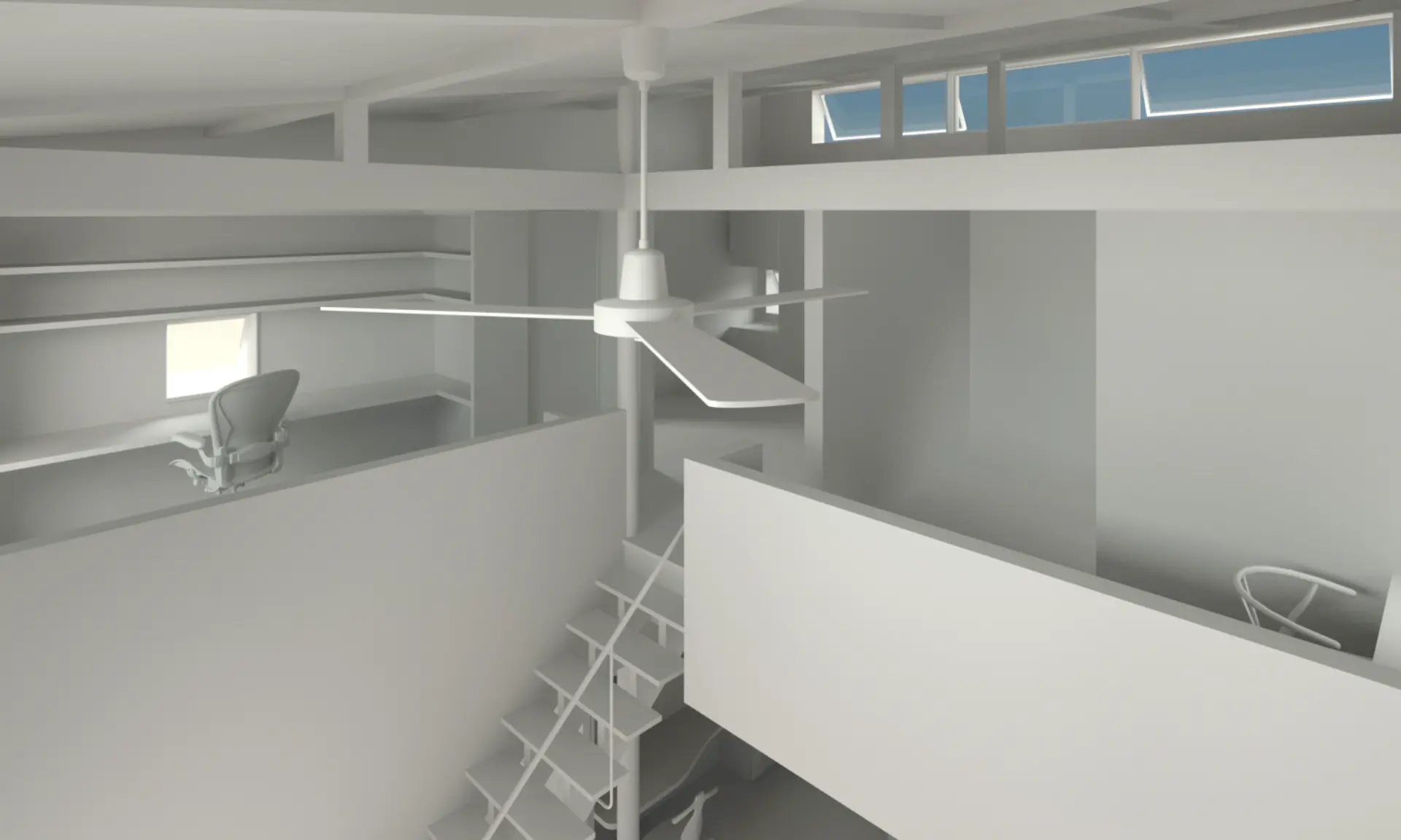 夏の風の通り抜け、冬の薪ストーブからの熱の移動を意識した。また、断面模型(CG)でみるとこれらが連想しやすく施主への伝わり方もよかった。計画での吹き抜けのバランスや2階の部屋同士のつながり感が伝わってくるのも立体の強みだろう。