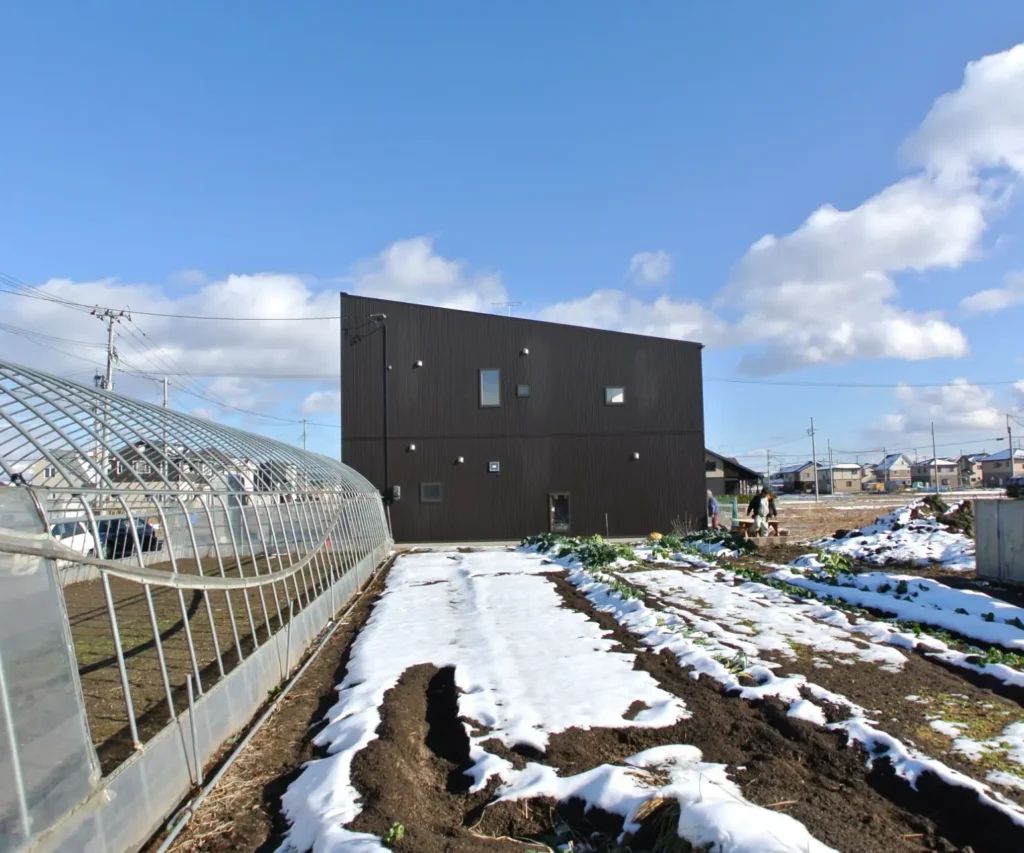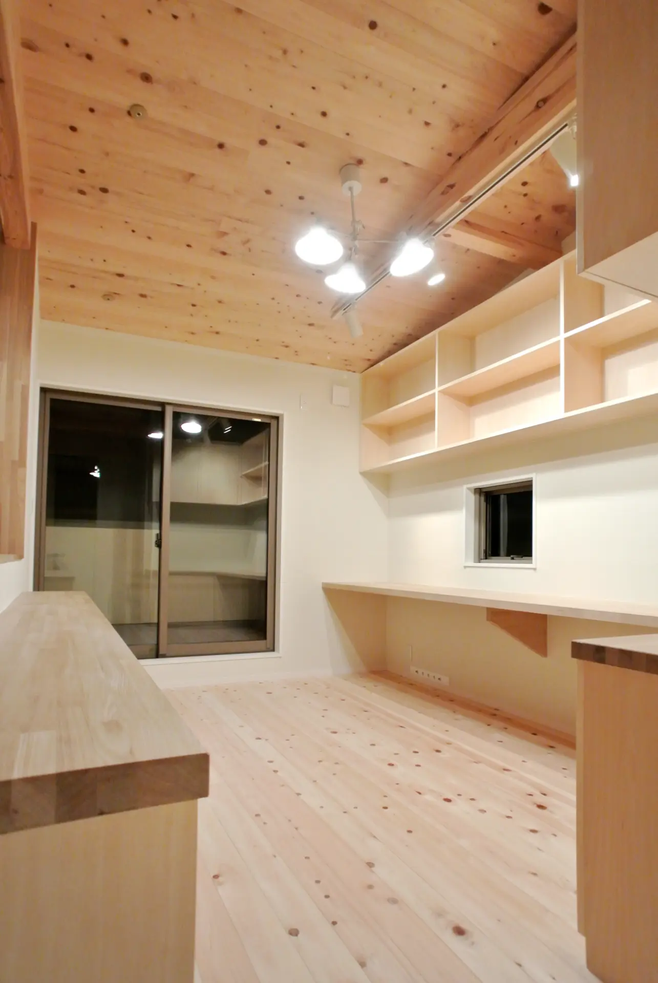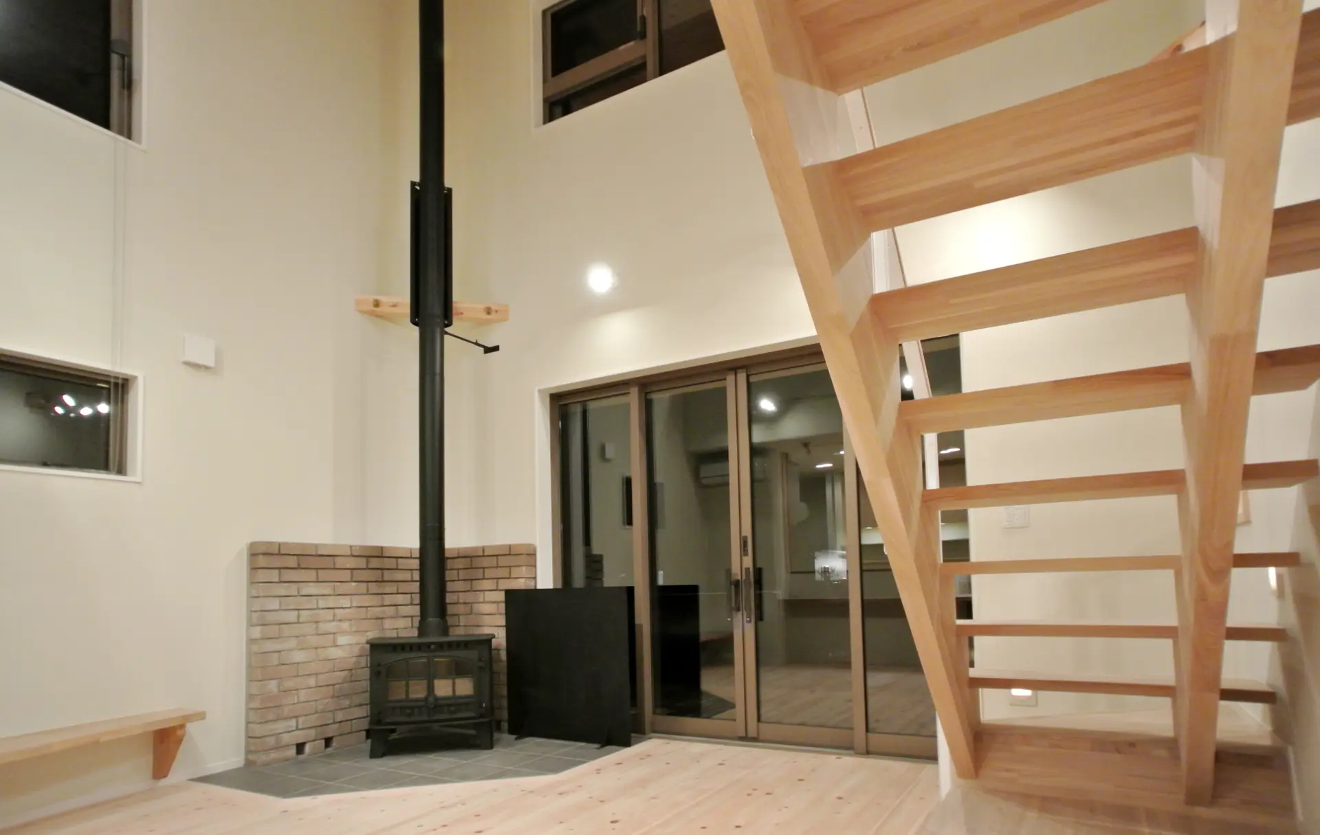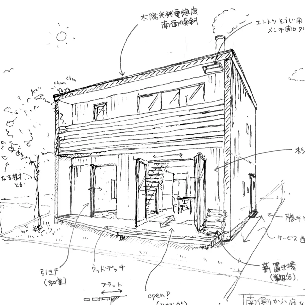 計画地は福島県郡山市。敷地は南北に長い長方形で周囲は田畑だが、今後多数の住宅建設が予想される。施主の希望で薪ストーブを囲んだ生活の場をイメージし、全開口されるサッシは床同レベルのウッドデッキに続いている。薪ストーブは床より150下げラウンジピットとし、利便性を考慮して土間扱いとした。自宅で仕事をする夫と、大学で教職に就く妻の書斎を吹き抜けの周りに配置し、互いのテリトリーを守りつつ人の居る雰囲気を守りたかった。2階にある幼い子供の部屋は今は予備室とし、家族が増えたときの為に間仕切り可能な構造としたい。福島という土地柄、駐車スペースは3台確保し、薪ストーブ用の薪置き場も考慮に入れた。