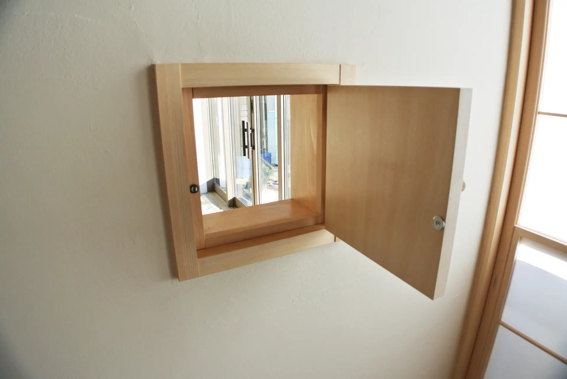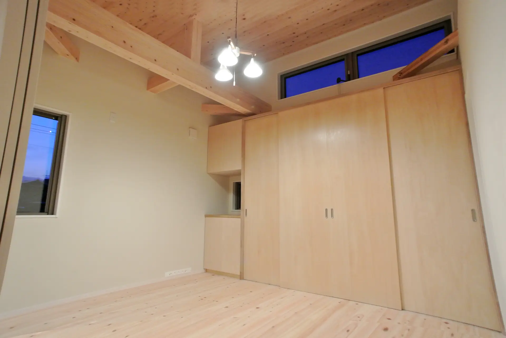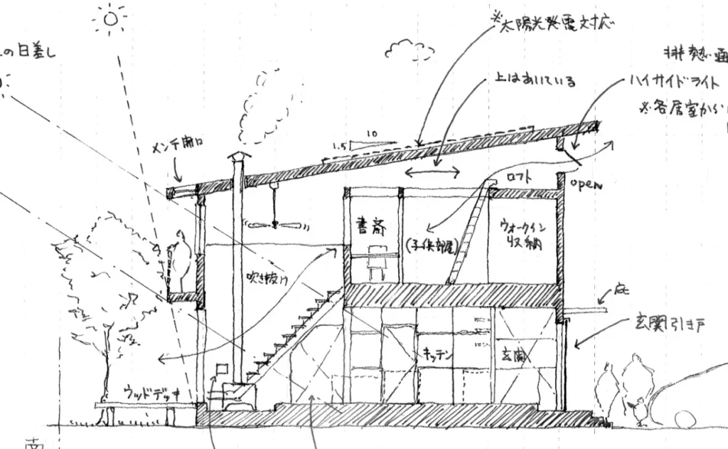 南北へと流れる風を取り入れたい。できるだけ広いリビング開口を得たいのと、必要スペースのボリュームから潔く肩流れの形状でいくことに決めた。北面上部に開閉のハイサイドライトを配し、排熱・通風・採光の確保を狙っている。また、将来の太陽光パネル設置を想定し南面下がりとした。