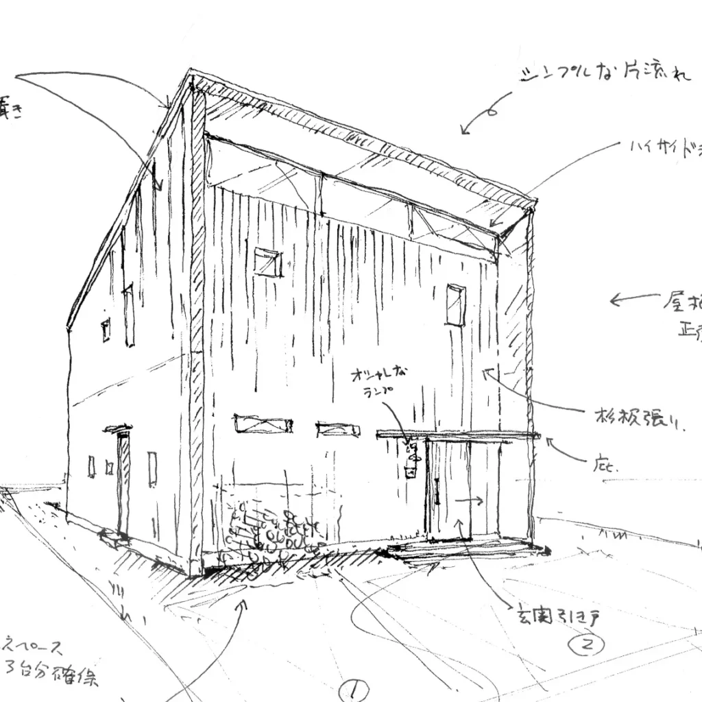 余計なことはしないでいこう。縦に長い敷地、接道の関係からプランを素直にとらえ、そのまま立ち上げた形をとった。建物全体をコの字で囲い、側面は塗り壁、フェイス(南北面)には杉板張りとしたい。(計画初期段階)